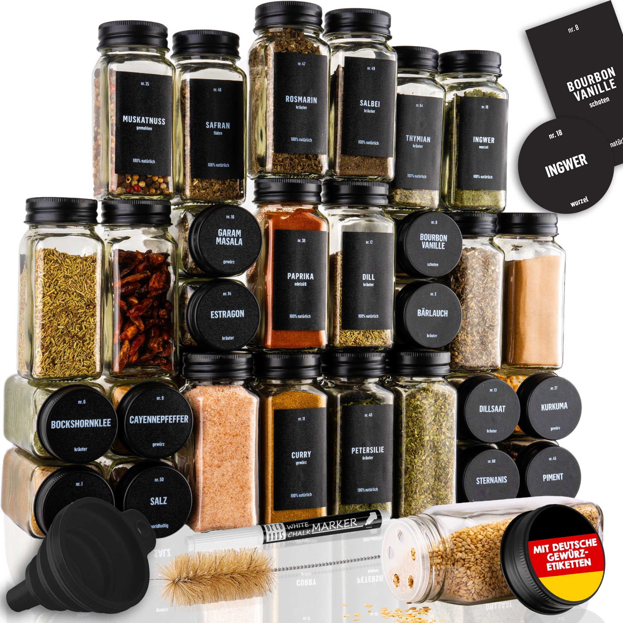 Ne dobite le 36 odličnih kozarčkov za začimbe, ampak celoten komplet, v katerem boste našli vse, kar potrebujete. Vključenih je 100 prednatisnjenih okroglih nalepk z imeni začimb v nemščini, 100 prednatisnjenih pravokotnih nalepk z imeni začimb v nemščini, 40 praznih okroglih nalepk in 40 praznih pravokotnih nalepk na katere lahko pišete s priloženim visokokakovostnim krednim pisalom.