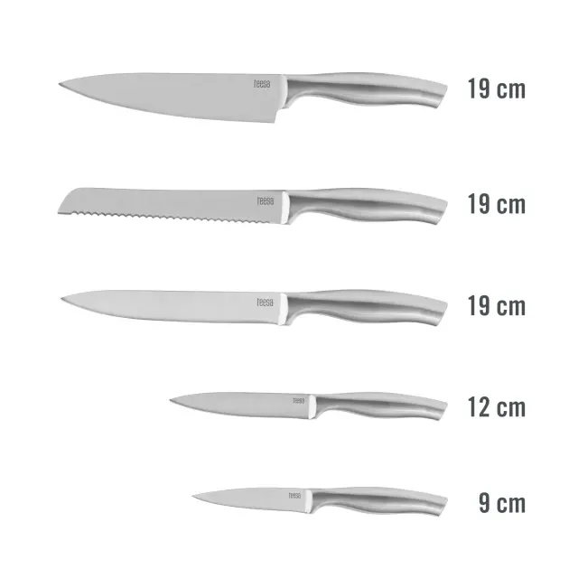 Ta komplet kuhinjskih nožev v lesenem bloku ni samo estetskega videza, ampak tudi veliko lažje vzdržuje red, zavzame malo prostora na pultu in je univerzalen zahvaljujoč 5 različnim rezilom. Noži iz seta Teesa vam bodo v pomoč pri številnih vsakodnevnih opravilih, kot so rezanje kruha, mesa, filetiranje rib, lupljenje sadja in zelenjave ali sekljanje zelišč.