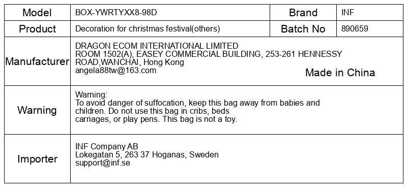 Opozorilo: Da preprečite nevarnost zadušitve, hranite to torbo stran od dojenčkov in otrok. Te vrečke ne uporabljajte v otroških posteljah, posteljnih vozičkih ali igralih. Ta torba ni igrača.