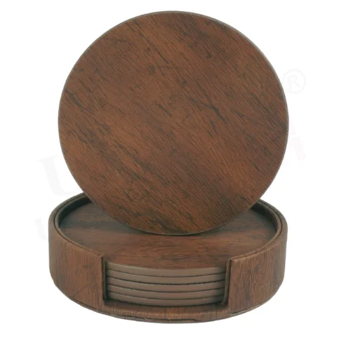 Komplet 6 okroglih podstavkov iz PU usnja z držali Brown