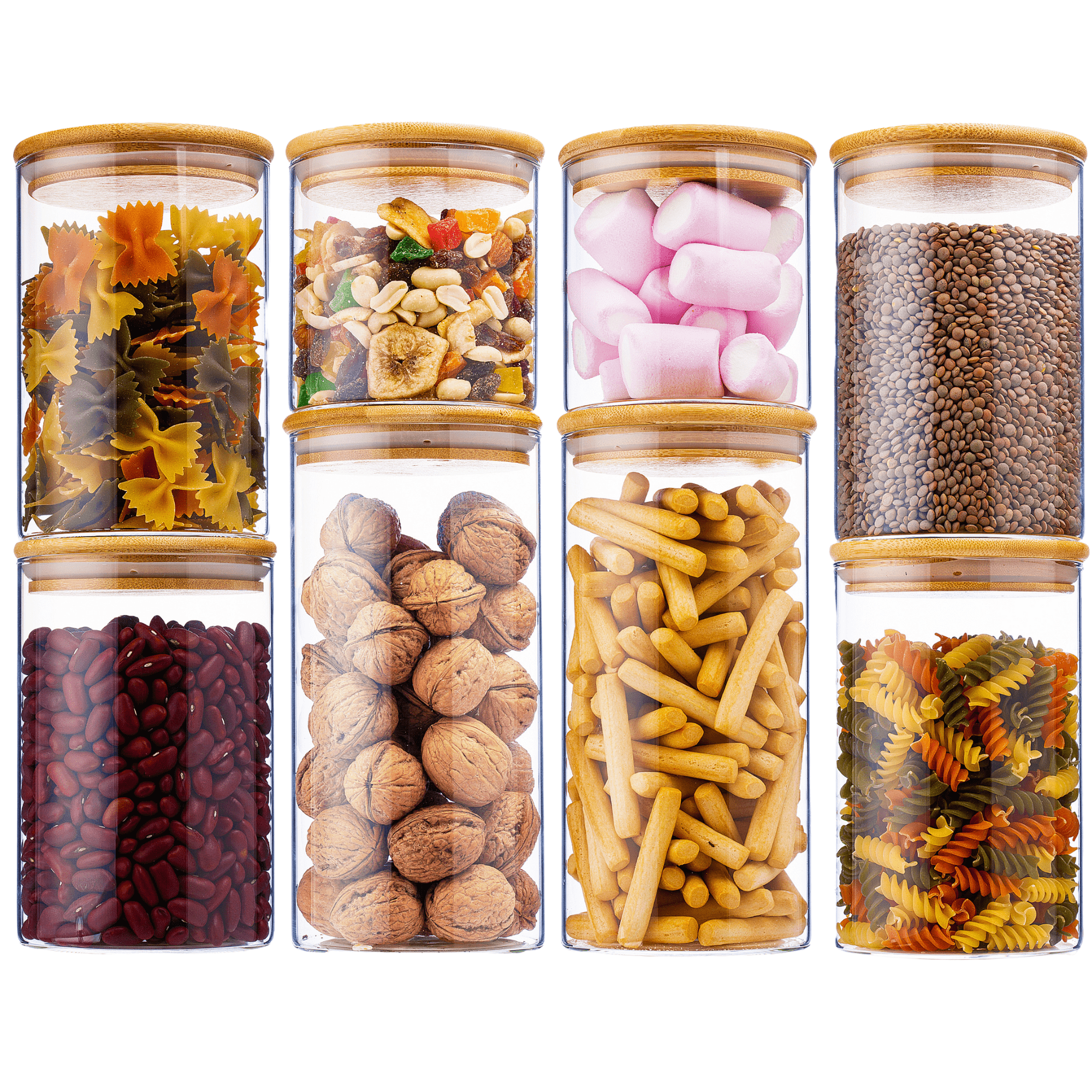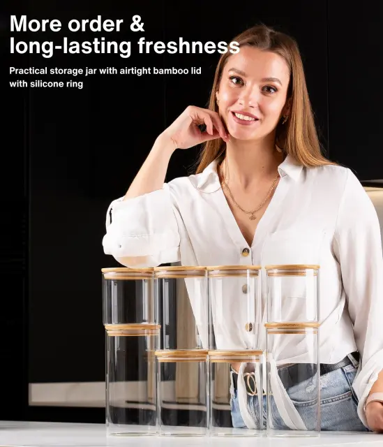 OPTIMALNA ORGANIZACIJA – Z našimi praktičnimi kozarci z bambusovim pokrovom bo vaša kuhinja vedno urejena. Ne glede na to, ali boste kozarce hranili na kuhinjskem pultu, v kredenci, shrambi ali omari, boste takoj našli, kar potrebujete!