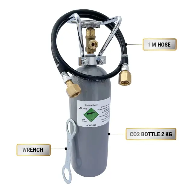 Odkrivajte popolni kompletni set CO2 za Sodastream, ki prinaša vse potrebno za neprekinjeno uživanje v gaziranih napitkih doma. Ta vrhunski paket vključuje 2 kg CO2 jeklenko, visokokakovostni cevni set z adapterjem in inovativen neizgubljiv ključ za kislo kislo.