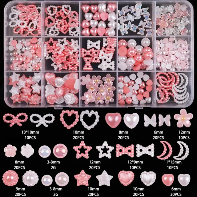 Vsestranski dizajn: Ta komplet vsebuje čudovito roza barvo in izbor očarljivih dizajnov, vključno z pentljami, trakovi, votlimi srčki in umetnimi biseri. Drobni detajli dodajo pridih elegance in prefinjenosti vsakemu dizajnu nohtov.
