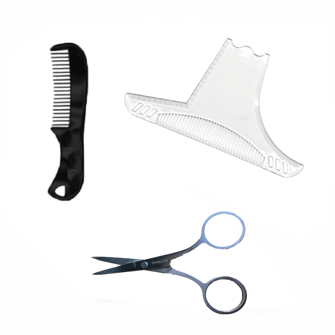 Seznam izdelkov: glavnik za oblikovanje las x1, glavnik za brke x1, škarje za brado x1, vrečka za kuverte x1