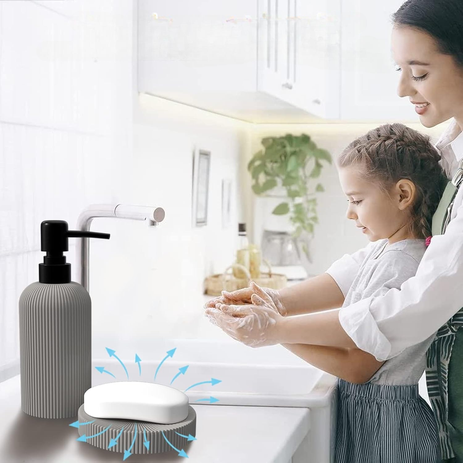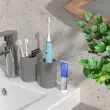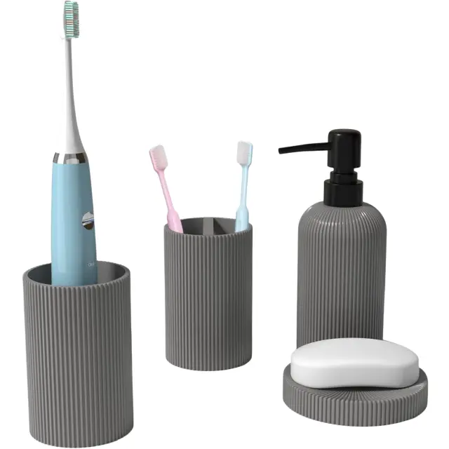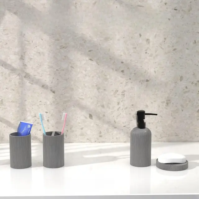 Ta moderen komplet kopalniških dodatkov predstavlja idealno rešitev za vse uporabnike, ki v svojem domu cenijo kombinacijo sloga in praktične funkcionalnosti. Komplet vključuje štiri ključne elemente, kot so milnica, posoda, dozirnik za milo in lonček za ščetke, ki skupaj poskrbijo za popolno organizacijo umivalnega prostora. Vsi deli so zasnovani tako, da ohranjajo red in estetiko, hkrati pa omogočajo enostaven dostop do higienskih pripomočkov med vsakodnevno uporabo. Minimalističen dizajn z mat sivim zaključkom se harmonično prilega različnim notranjim ureditvam in v prostor prinese pridih sodobne elegance.