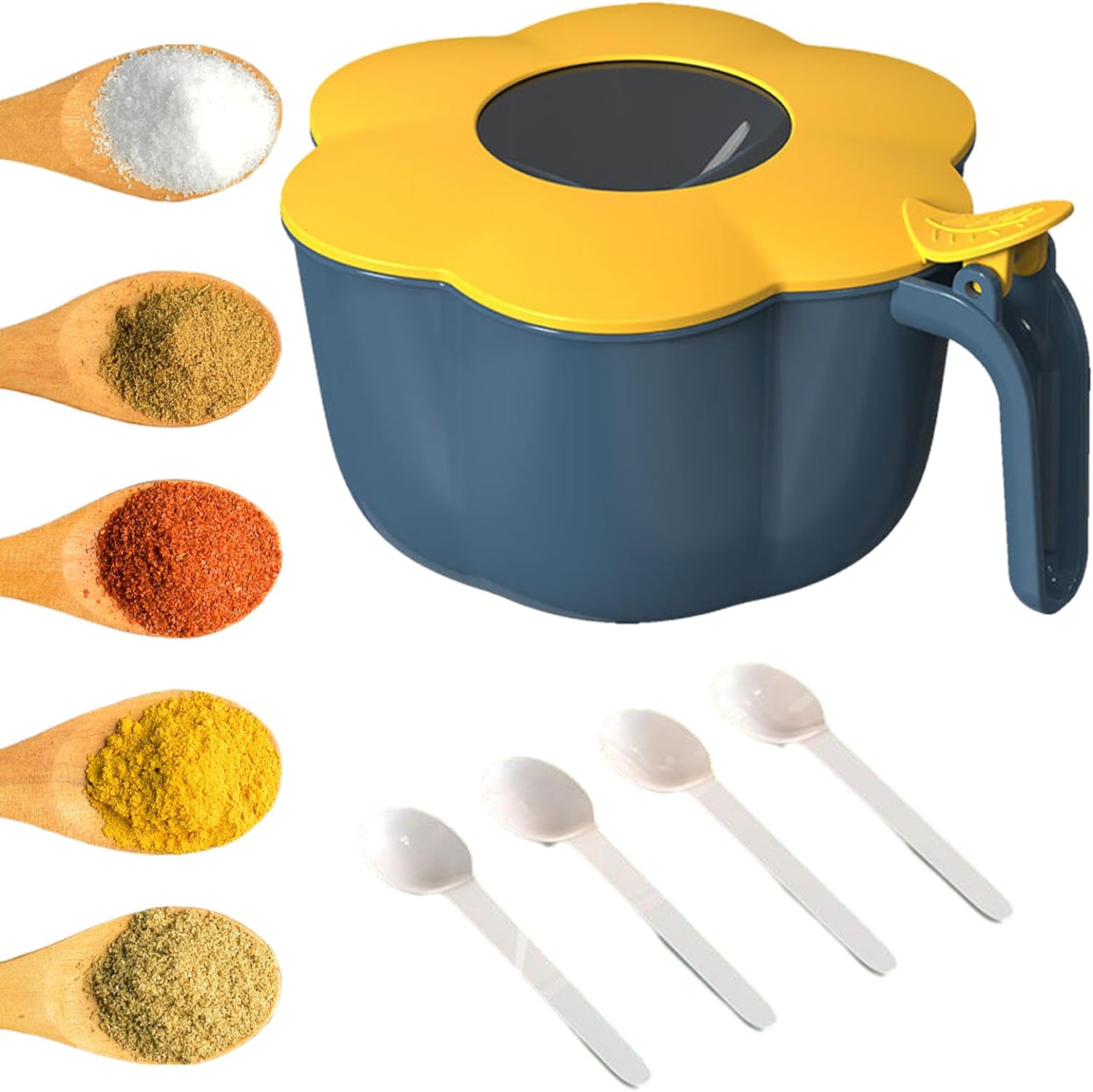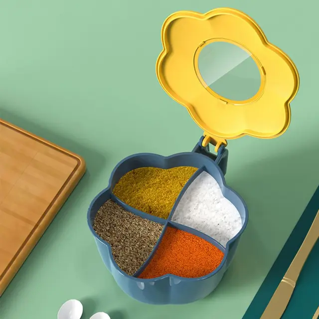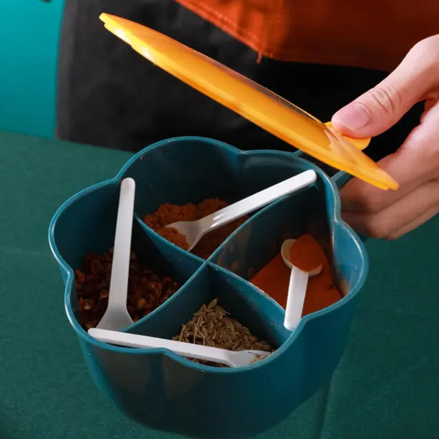 PREPROST ZA UPORABO: enoročno upravljanje olajša dostop do začimb tudi med napornimi trenutki kuhanja. Zasnova stranskega ročaja vam olajša nošenje s seboj. Pritisnite, da odprete za brezhibno delovanje. ORGANIZIRANO IN MODERNO: Ta posoda za sol in sladkor ima prozoren pokrov na sredini, tako da lahko jasno vidite notranjost in zlahka prepoznate vsako začimbo, ne da bi morali odpreti pokrov. Prav tako ima veliko zmogljivost in lahko sprejme veliko količino začimb, zaradi česar je kuhanje bolj priročno in prijetno. ENOSTAVNO VZDRŽEVANJE: Ta škatla za začimbe s 4 predelki in zaprto žlico je izdelana iz gladkega PP materiala in jo je mogoče enostavno očistiti z vlažno krpo. uporabo, s čimer zagotovite, da vaši vohuni ostanejo higienski. Preprosta oblika rože doda pridih elegance in je popolna za vsak kuhinjski dekor. TRŽLJIV IN ORGANIZIRAN: Brezhibno shranite različne sorte začimb v našo škatlo za začimbe s posameznimi predelki in zaprtimi žlicami. Zasnova, odporna proti prahu, in odlično tesnjenje preprečujeta kontaminacijo z oljem ter zagotavljata varno in higienično shranjevanje, obenem pa omogočata enostaven dostop do začimb. OBLIKA 4 V 1: Naša škatla za začimbe z ločenimi razdelki ima razdeljeno mrežo in prozoren pokrov, ki je odlična rešitev za ohranjanje prvotnega okusa in arome vaših začimb. Vrtljiv pokrov, zaščiten pred posegi, preprečuje kontaminacijo, medtem ko vam priročna zasnova 4 v 1 omogoča enostavno shranjevanje različnih vrst vohunov.