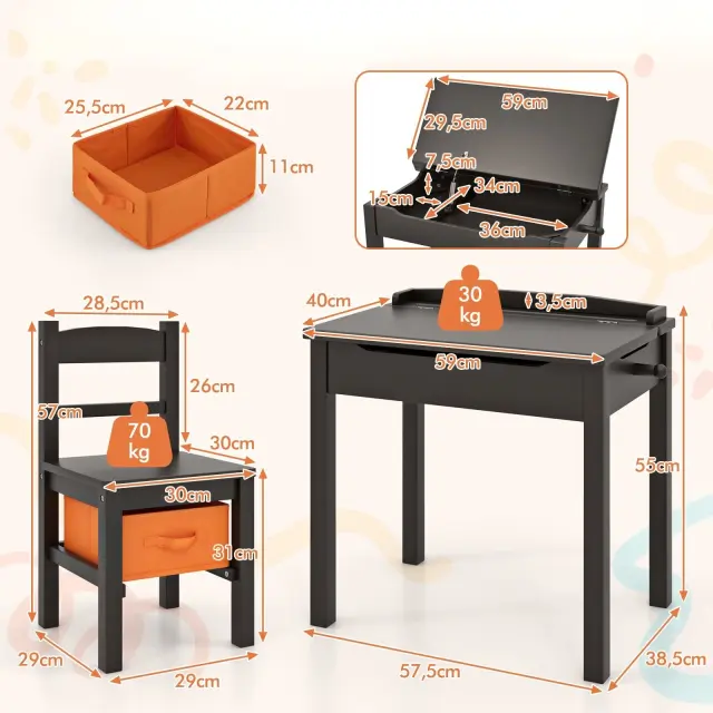 Zaradi varnostnih tečajev in ergonomsko oblikovane vdolbine za ročaj je mizno ploščo mogoče enostavno zložiti navzgor in navzdol. Pod mizo je velik prostor za shranjevanje otroških predmetov, kot so slikanice, zvezki, papirji, majhne igrače itd. Vgrajena reža za pisala in kavelj za nahrbtnik na strani sta zasnovana tako, da zmanjšujeta nered ter ohranjata urejenost učnega prostora. Poleg tega ima stol vgrajeno škatlo za shranjevanje, v kateri lahko otroci uredijo svoje predmete. Ta komplet mize in stola je izdelan iz izbranega masivnega lesa in MDF ter je trpežen in stabilen. Pisalna miza lahko nosi do 30 kg, stol pa do 70 kg. Poleg tega lahko zaobljeni vogali in gladki robovi učinkovito ščitijo otroke pred naključnimi udarci ali praskami.