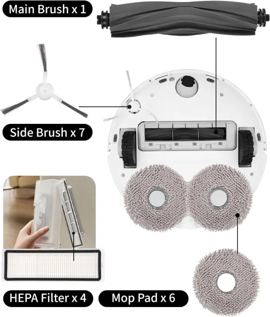 Enostavna namestitev in zamenjava: Deli so zasnovani za enostavno namestitev in zamenjavo, tako da se vaš robotski sesalnik v trenutku vrne k čiščenju. Preprosto zamenjajte stare dele z novimi iz kompleta in uživajte v revitalizirani izkušnji čiščenja.