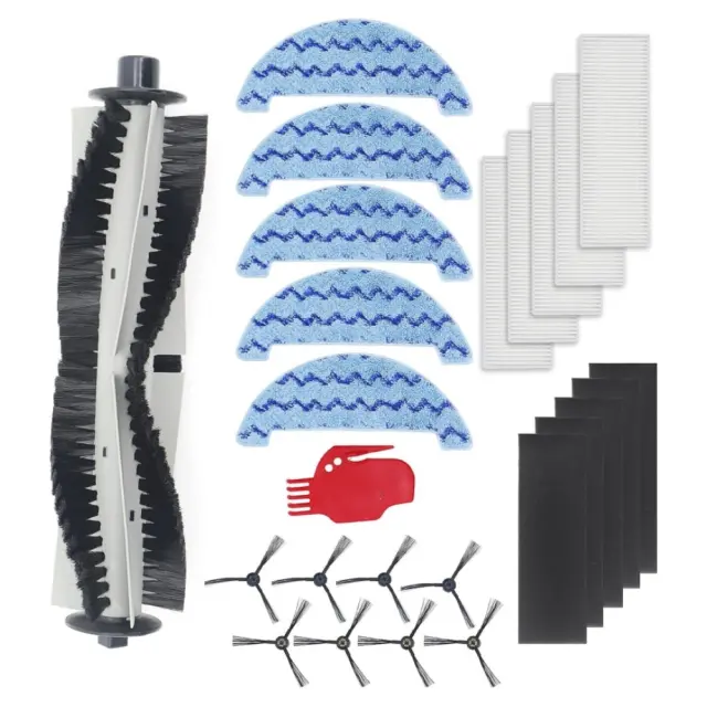 Celovito čiščenje: Komplet vključuje različne komponente, kot so glavna krtača, stranske krtače, krpe za brisanje, čistilna krtača, filtri in gobice, za vse vaše potrebe po čiščenju.