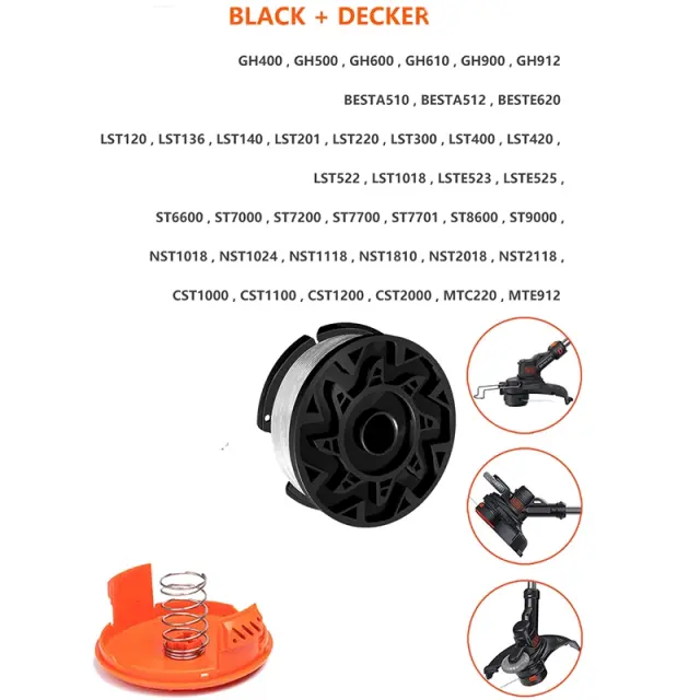 Široka združljivost: Ta komplet tuljav je združljiv s široko paleto trimerjev BLACK+DECKER, vključno z modeli GL280, GL301, GLC13, GLC2500, GLC3000, GLC3630L, GLC425, GL430, GL5430, GL54, GL5, GL54, GL 60, GL570, GL580, GL4525 ST201, LST220, LST300, LST400, LST420, LST522, LST1018, LSTE523, LSTE525, ST6600, ST7000, ST7200, ST7700, ST7701, ST8600, ST9000, NST1018, NST1024, NST1118, NST1810, NST2018, NST2118, CST1000, CST1100, CST1200, CST2000, MTC220 in MTE912.