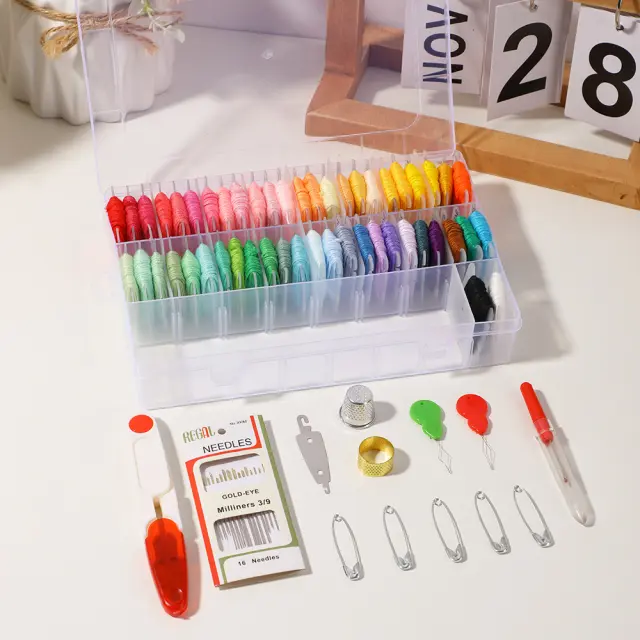 Priročno shranjevanje: Komplet niti za vezenje je opremljen z robustno škatlo za shranjevanje, ki ohranja vse vaše pripomočke organizirane in na enem mestu. Škatla ima prozoren pokrov, tako da lahko enostavno vidite, kaj je v notranjosti.
