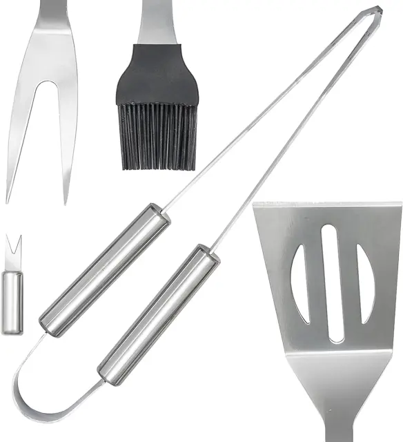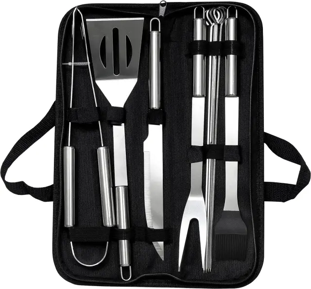 10-delni komplet pripomočkov za peko na žaru - To je odličen komplet orodij za peko na žaru, ki vključuje 1 klešče za peko na žaru, 1 vilice za peko na žaru, 1 lopato za peko na žaru, 1 nož za peko na žaru, 1 krtača za peko na žaru, 4 nabodala za peko na žaru iz nerjavečega jekla, izpolnjujejo vse vaše potrebe po pripomočkih za peko na žaru. VISOKO KAKOVOSTNO ORODJE ZA PEKO NA ŽARU - Naš komplet posod za žar je izdelan iz nerjavečega jekla, primernega za živila, je nestrupen, odporen proti rji in vzdržljiv, tako da pokanje ni problem. PROTI OPARINAM - Pripomočki za žar iz nerjavečega jekla s podolgovatimi ročaji, odpornimi na vročino, ščitijo vaše roke pred vročino. ENOSTAVEN ZA SHRANJEVANJE IN PRENOŠANJE - Priložen je prenosni kovček za shranjevanje orodja na točno določenih lokacijah, priročno, da ga vzamete s seboj na kampiranje ali na svojo teraso in vrt. Ta komplet orodij za peko na žaru je odlična izbira za sladokusce, ljubitelje peke na žaru, kuharje in ljubitelje kampiranja. Popoln BBQ set za piknik, BBQ, kampiranje in pohodništvo. - Odlična BBW orodja za peko zelenjave, mesa, morskih sadežev, pic, ražnjičev, klobas, slanine, piščančjih peruti, rebrc, palačink in palačink ter še veliko več - Komplet orodij za žar je odlična izbira za ljubitelje žara, ljubitelje kampiranja, kuharja ali pogosto prirejajte večerjo - Izdelano iz nerjavečega jekla, primernega za živila, 100 % nestrupeno, proti prijemanju, vzdržljivo in za večkratno uporabo - Toplotno. Neprevodni ročaj iz nerjavečega jekla, odporen na vročino in proti opeklinam, varen in priročen za držanje - ima prenosno torbo za shranjevanje za shranjevanje in pritrditev orodja na njihovo točno lokacijo, 1 x klešče za žar (34 x 4,2 cm), 1 x Vilice za žar (35 x 3,3 cm), 1 x lopatica za žar (34,8 x 7,6 cm), 1 x krtača za žar (34 x 4 cm). Nož (32,6 x 2,5 cm), 4 x nabodala (35,5 cm).