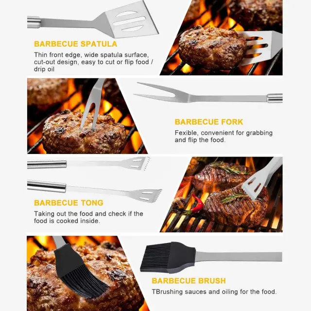 【Komplet jedilnega pribora za žar】Neprekosljivi pripomočki za peko na žaru so bili skrbno zasnovani, da zagotavljajo neprimerljivo varnost in udobje. Nadgradite svoj komplet za peko na žaru z našim kompletom delov pribora za peko na žaru in svojo izkušnjo peke na žaru boste dvignili na povsem novo raven.