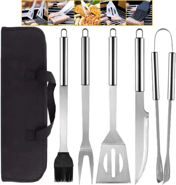 【5-delni komplet jedilnega pribora za peko na žaru】Vilice za peko na žaru, nož z majhnim ročajem, lopatica za peko na žaru, klešče za peko na žaru, čopič za piling in priročna torba za shranjevanje. S temi orodji je popolna uporaba katere koli vrste žara. Pripomočki za peko na žaru so primerni tudi za pomivanje v pomivalnem stroju.