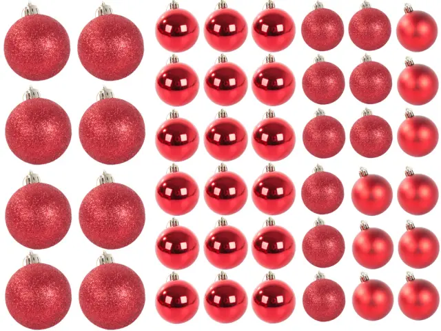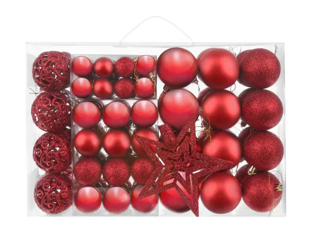 SPECIFIKACIJA – barva: rdeča; material: plastika; število kosov v kompletu: 100 + zvezdica; vrste kroglic: mat, bleščeče, sijoče, odprte; premeri kroglic: 6/4/3 cm; mere zvezdice (dolžina / širina): 12/14 cm; teža: 0,7 kg; teža v paketu: 0,9 kg.