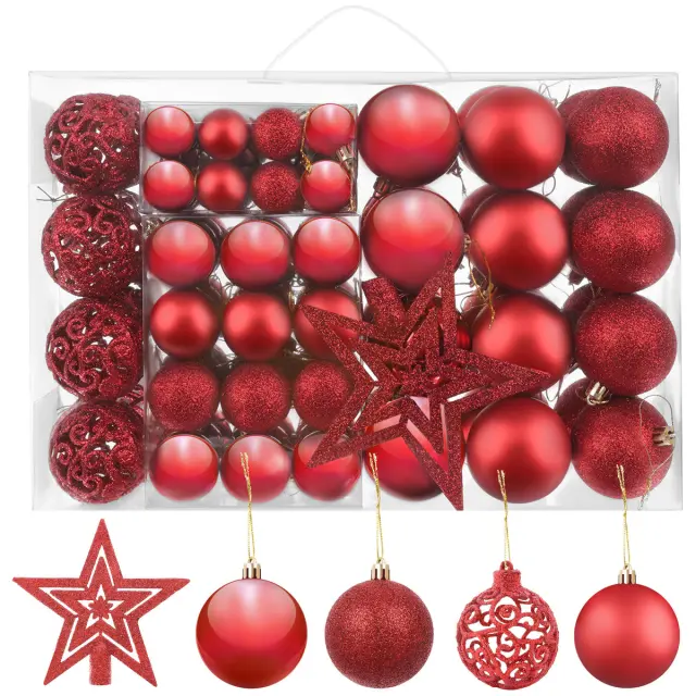RAZLIČNE VELIKOSTI IN VRSTE – komplet kroglic je sestavljen iz kar 4 klasičnih vzorcev in 3 velikosti , ki bodo všeč vsakomur. Okraski imajo premer 3, 4 in 6 centimetrov . Imajo mat, bleščečo in sijočo površino. Priložene so tudi božične kroglice z vpadljivim odprtim zaključkom. Čudovita bleščeča zvezda bo vrhunec procesa okraševanja božičnega drevesa.