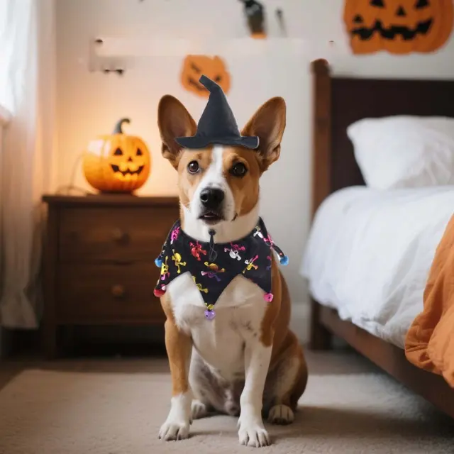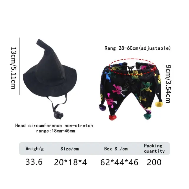 Edinstven dizajn za noč čarovnic: Komplet šalov za hišne ljubljenčke ima edinstven dizajn za noč čarovnic, ki bo vašega ljubljenčka izstopal iz množice. Komplet vključuje klobuk čarovnice in šal, oba okrašena z barvitimi vzorci. Ta komplet je kot nalašč za dodajanje prazničnega pridiha videzu vašega ljubljenčka in ga naredi središče pozornosti na kateri koli zabavi za noč čarovnic.