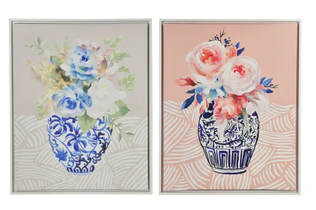 Komplet stenskih slik INGA (2 kosa) v formatu 40 x 50 cm prinaša v prostor nežno eleganco in umirjen dekorativni poudarek. Motiva prikazujeta poslikana vaza v prefinjenih rožnatih in modrih odtenkih, dopolnjena s cvetličnimi detajli, ki ustvarijo harmonično in uravnoteženo kompozicijo.