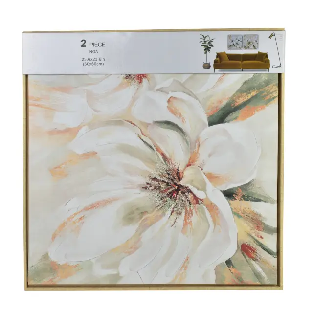 Komplet stenskih slik Prima INGA prinaša v prostor subtilno eleganco in občutek zračnosti. V setu sta dve dekorativni sliki dimenzij 60x60 cm z ročno naslikanimi belimi cvetovi, ki s svetlo, naravno barvno paleto vizualno umirita ambient in mu dodata prefinjen značaj. Obe sliki sta uokvirjeni v svetlo rjave okvirje, ki poudarijo toplino kompozicije ter poskrbijo za harmoničen prehod med motivom in opremo prostora.
