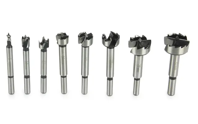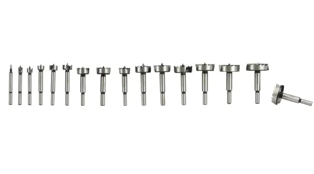 Osrednja konica zagotavlja natančno pozicioniranje svedra, rezila po obodu zagotavljajo brez odrezkov in natančno vrtanje lukenj. Zasnovan za vrtanje natančnih lukenj brez trganja robov v mehak les, vezan les. Komplet je pakiran v leseni škatli.