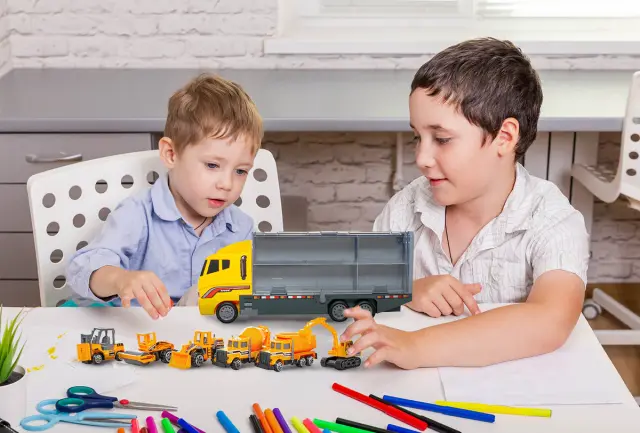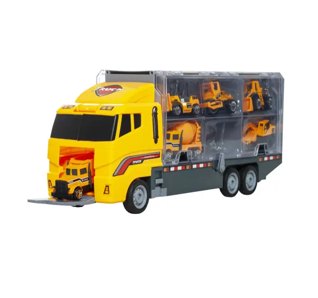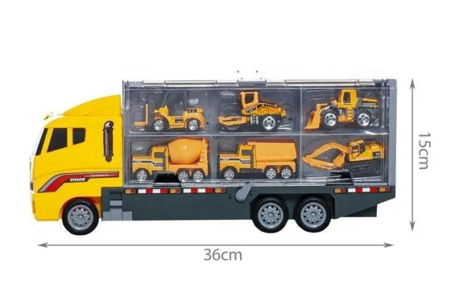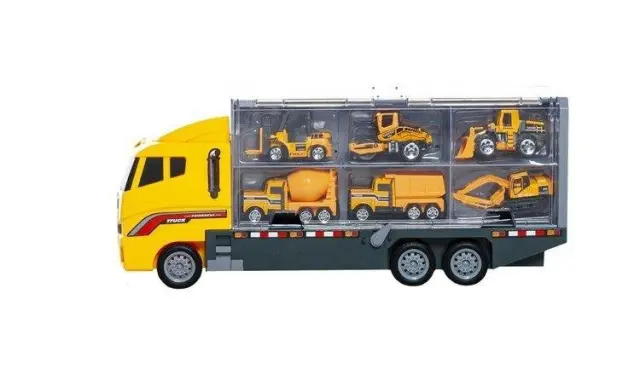 VELIK SET – komplet sestavlja tovornjak in 6 gradbenih strojev. Ima funkcijo odvijanja, zahvaljujoč kateri lahko avtomobile enostavno odstranite iz vlačilca. Igrača je bila narejena zelo skrbno, z reprodukcijo vseh podrobnosti. Deluje realistično, kar malčka spodbuja k igri.