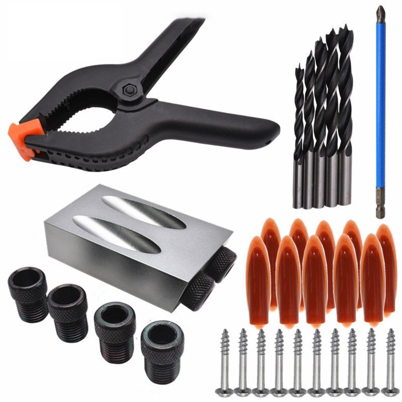 Celoten komplet: Ta 34-delni komplet vključuje vse, kar potrebujete za vrtanje pod kotom: 15-stopinjsko orodje za iskanje lukenj pod kotom, vijake, moznike, nastavek za izvijač, objemko za obdelavo lesa in svedre za različne velikosti.