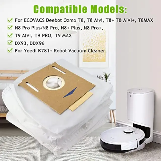 Združljivo z različnimi modeli: Naš komplet vrečk za prah je zasnovan tako, da je združljiv z Yeedi K781+, ECOVACS Deebot Ozmo T8 AIVI, T8 Max, AIVI, serijami T8, serijami T9, T9+, N8, N8 Pro in Plus, kompletom avtomatske postaje za praznjenje DX93, DDX96. Zagotovite brezhibno združljivost in učinkovito zbiranje prahu s svojim sesalnikom.