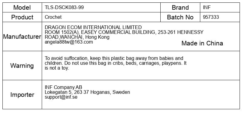 Da se izognete zadušitvi, hranite to plastično vrečko stran od dojenčkov in otrok. Te vrečke ne uporabljajte v zibelkah, posteljah, vozičkih, stajicah. To ni igrača.