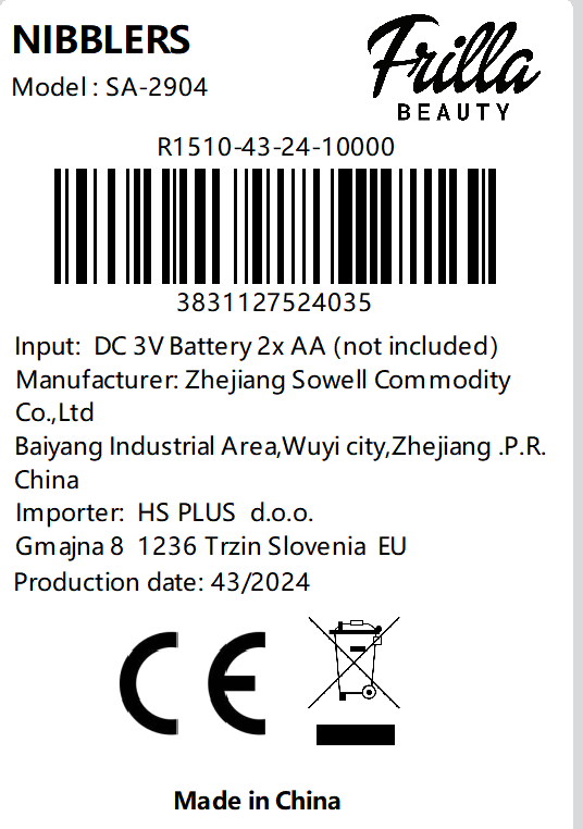 Enostavna uporaba Vstavite 2 x AA bateriji in varno zaprite pokrov (baterije niso vključene). Glede na starost izberite ustrezno brusilno glavo. Na napravo pritrdite izbrano brusilno glavo. Pritisnite gumb, da nastavite vrtenje in hitrost glede na stopnjo udobja. Previdno obrezujte nohte, dokler ne dosežete želene dolžine.
