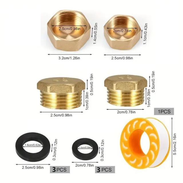 Celovit komplet čepov: Ta popolna izbira čepov za cevi vključuje dvanajst medeninastih čepov različnih velikosti (1/2", 3/4") skupaj s teflonskim trakom in podložkami. To vam omogoča, da obvladate različna vodovodna dela in zagotovite varno in vodotesno tesnjenje, kar vam prihrani čas in denar v primerjavi z nakupom posameznih komponent. Popolno za profesionalne vodovodarje in ljubitelje domače obrti, ki se ukvarjajo s popravili ali namestitvami v gospodinjstvu. Komplet je zasnovan za udobje in vsestranskost ter ponuja vrsto možnosti za različne velikosti cevi in vrste povezav.
