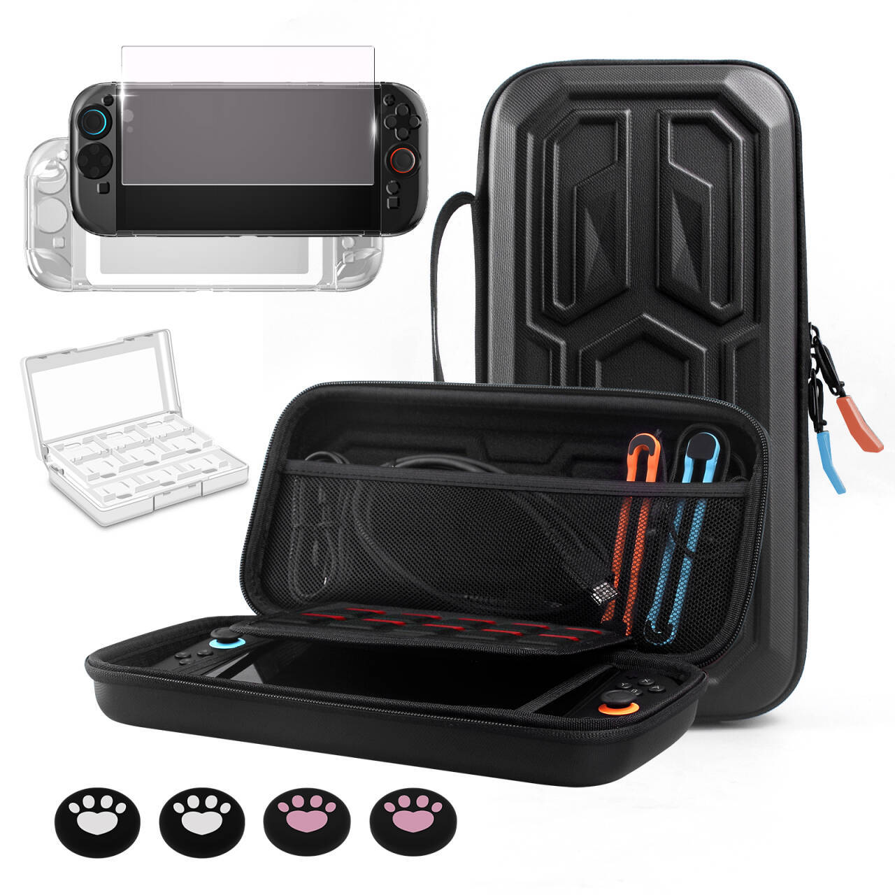 Organizirano shranjevanje: Naj bo vaša konzola Switch 2 in dodatki lepo organizirani s tem obsežnim kompletom etuija. Etui ima namenske predelke za konzolo, kartice iger in druge majhne dodatke, ki preprečujejo premikanje med transportom. Priložen etui za kartice iger zagotavlja dodatno shranjevanje za vaše najljubše igre, kar zagotavlja, da jih imate vedno pri roki. Nič več brskanja po torbah ali predalih – vse, kar potrebujete, je priročno shranjeno na enem mestu.