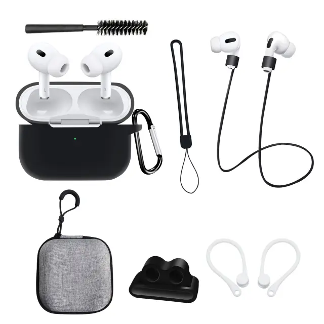 Popolna zaščita: Ta 8-delni komplet zagotavlja vsestransko zaščito za vaše AirPods Pro 2. Vključuje ohišje, kavelj, vrvico, ročni trak, bele TPU ušesne nastavke, držalo za pašček ure, čistilno krtačko in sivo torbico za prenašanje. Zaščitite svoje slušalke pred praskami, padci in vsakodnevno obrabo.