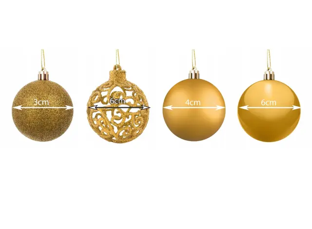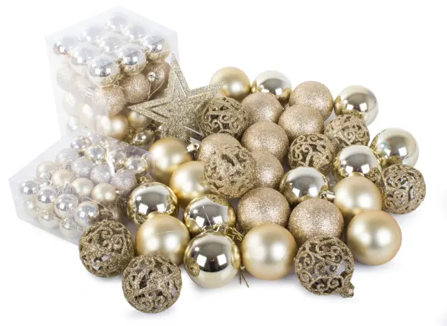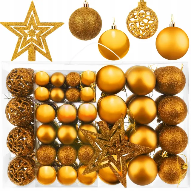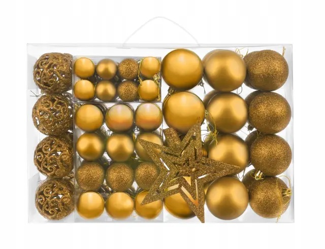 SPECIFIKACIJA – barva: zlata; material: plastika; število kosov v kompletu: 100 + zvezdica; vrste kroglic: mat, bleščeče, sijoče, odprte; premeri kroglic: 6/4/3 cm; mere zvezdice (dolžina / širina): 12/14 cm; teža: 0,7 kg; teža v paketu: 0,9 kg.