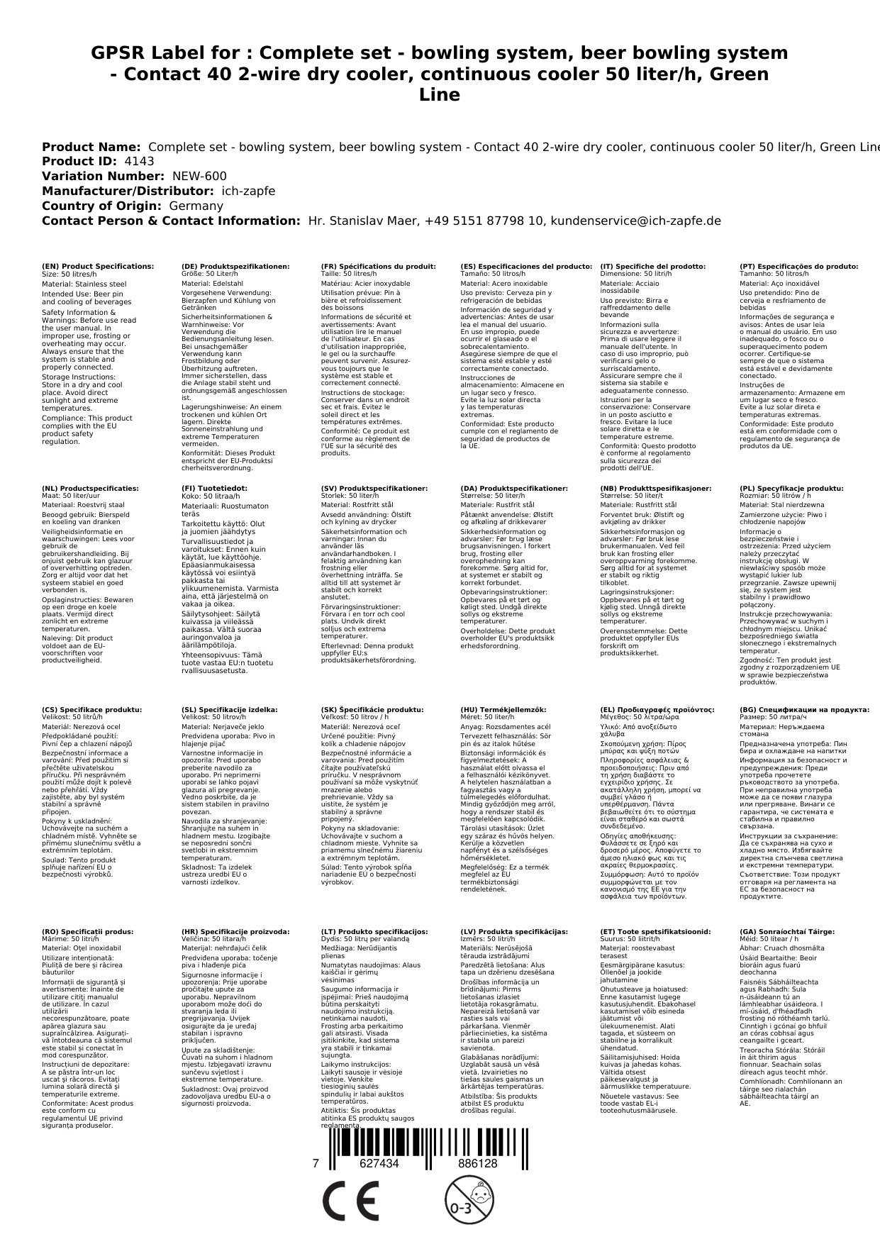 Kompletni set za črpanje piva vključuje napravo Kontakt 40 z dvema vodiloma, suhim hlajilnikom in pretočnim hlajilnikom s zmogljivostjo 50 litrov na uro. Izdelan iz lahkega nerjavečega jekla, opremljen z nerjavnim odkapnim pladnjem in kompenzacijskimi ventili za hlajenje. Naprava je pripravljena za delovanje v samo 2-4 minutah, z regulirano temperaturo med +3 in +10 °C.