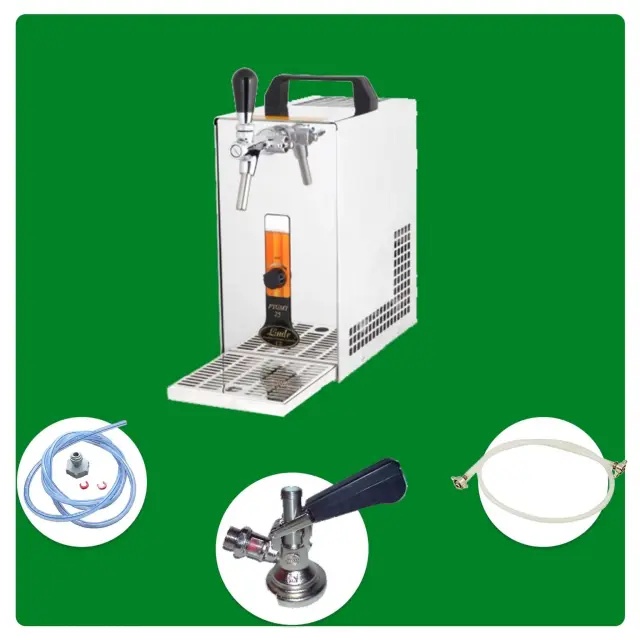 Ta kompletni set za točenje piva PYGMY 20/K z membransko črpalko in enokanalnim sušilnim hlajilnikom iz nerjavečega jekla je popolna izbira za domačo uporabo. Zagotavlja 25 litrov ohlajenega piva na uro pri temperaturi med +3 in +10 °C, ki jo lahko regulirate po želji.