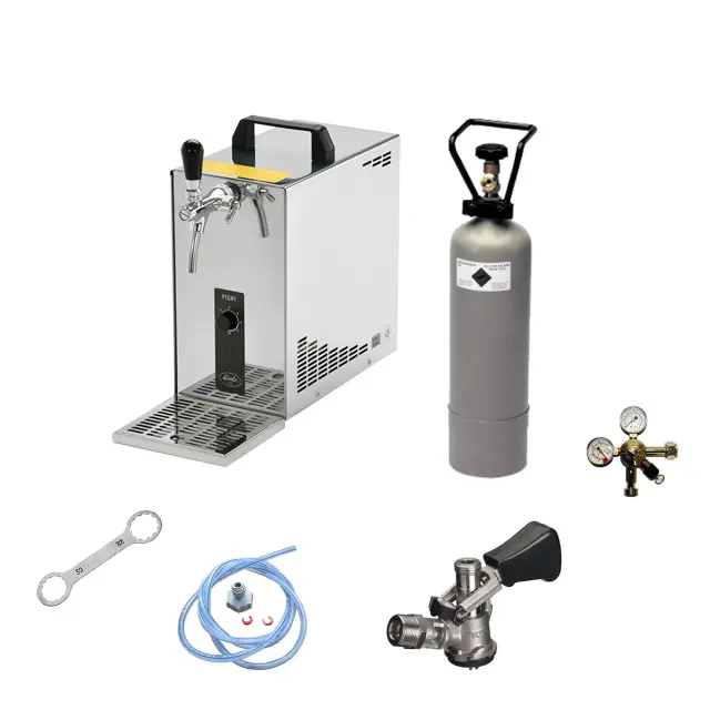 Ta kompletni set naprave za črpanje piva PYGMY 25 enokanalne suhe hlaječe naprave iz nerjavečega jekla z zmogljivostjo 35 litrov/h pri 10 °C temperaturni razliki ponuja številne prednosti za vse, ki želijo uživati v svežem pivu. Ta lahka suha hlaječa naprava za črpanje piva iz nerjavečega jekla je pripravljena v samo 2-4 minutah in ima regulacijski obseg od +2 do +10 °C, kar zagotavlja optimalno kontrolo temperature za vaše pivo.