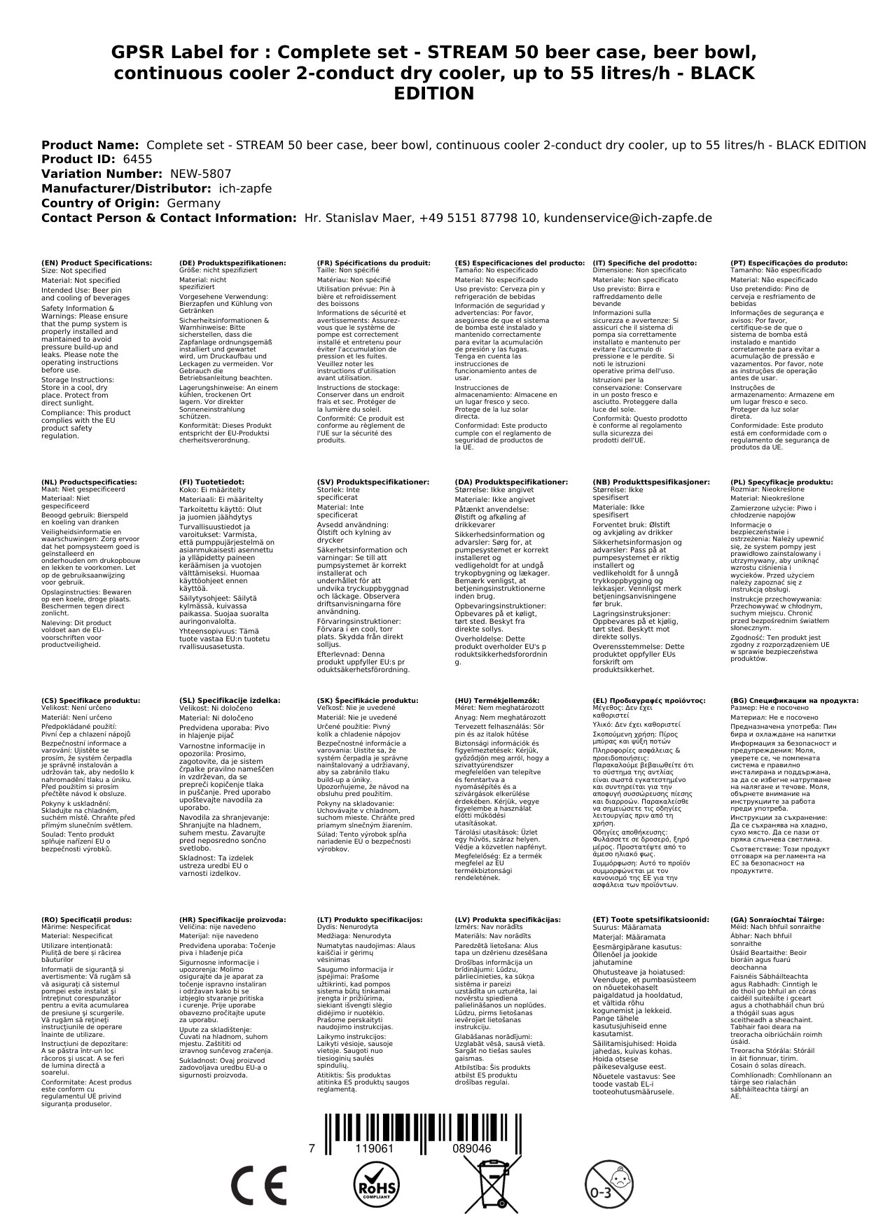 Tehnične specifikacije vključujejo mere 225 mm širine, 330 mm globine in 425 mm višine, težo 32 kg ter moč 421 W pri 230 V in 50 Hz. Komplet vsebuje Stream 50 sistem, 2-vodni suhi hlaječ, regulator tlaka CO2 za 2 liniji pri 3 bar, 2 kg CO2 jeklenko, 2 CO2 cevi dolžine 1,5 m, 2 pivo cevi John Guest 3/8' in 5/8', ključ za ogljikov dioksid in 2 izbirni glavi za črpanje.