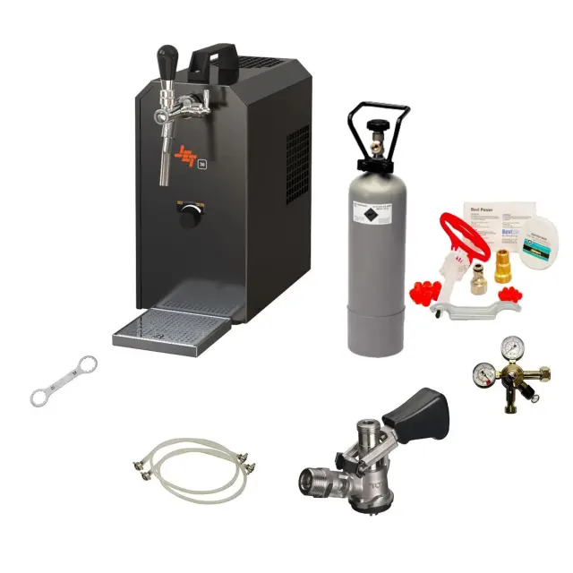 Dodatki: Regulator tlaka CO2 za 3 bar, 2 kg steklenica CO2, 1,5 m cev za CO2, 2 m bierska cev z nastavki, neizgubljiv ključ za CO2, adapter za 5-litrski sod.