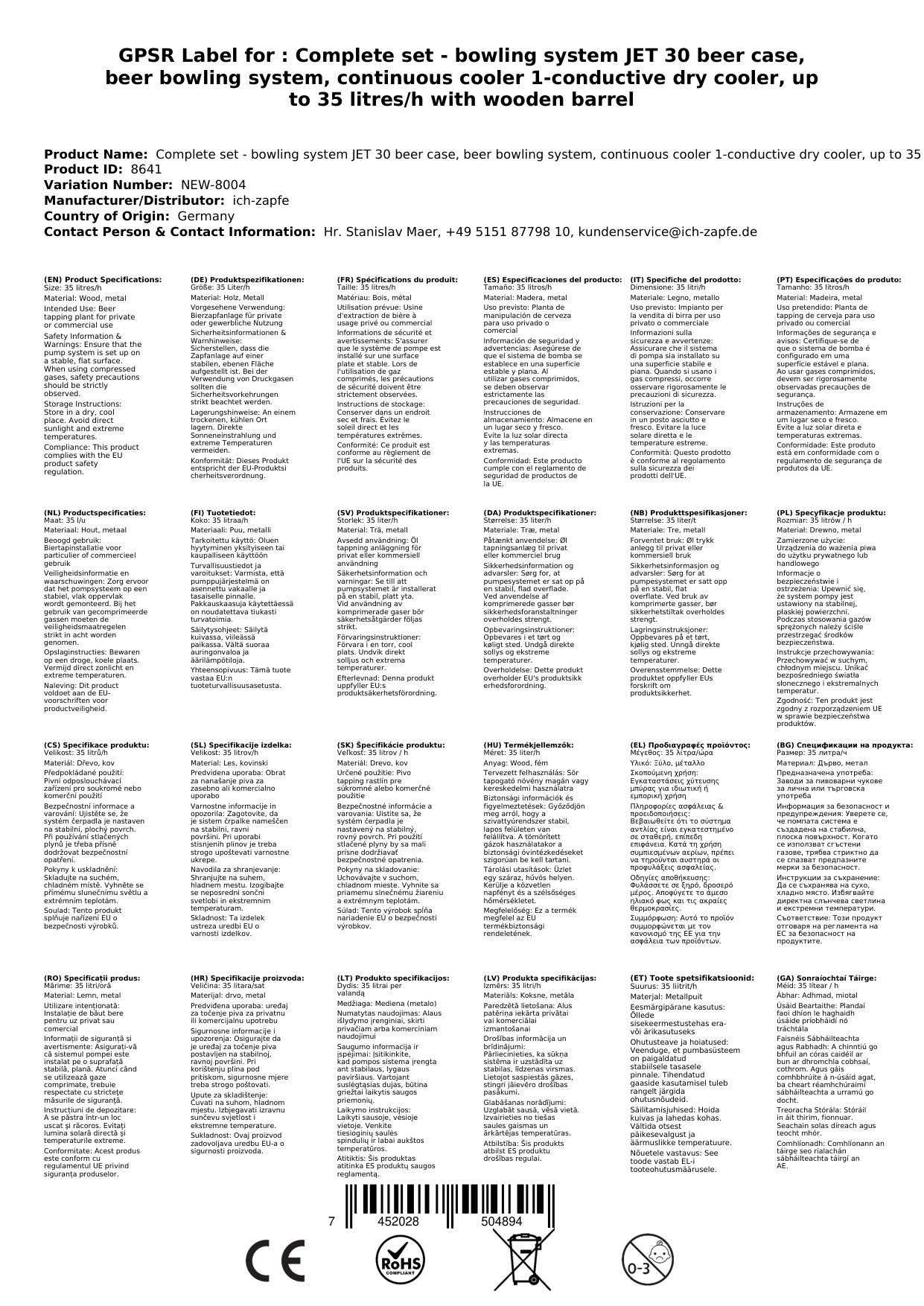Ta kompletni set je zasnovan za enostavno in učinkovito črpanje piva. Vključuje vse potrebne komponente za takojšnjo uporabo: JET 30 kovček za pivo z enojnim suhim hlajenjem do 35 litrov na uro, leseni sod za napravo JET 30, enojni regulator tlaka CO2 za napravo za črpanje piva pri 3 bar, 2,0 kg jeklenko CO2, popoln CO2 cev 1,5 m, cev za pivo John Guest s spojkami 3/8' in 5/8' dolžine 2,00 m, neizgubljiv ključ za ogljikov dioksid in adapter za 5-litrski sod. Ventili so na voljo po izbiri, kot so ravni, kombinirani, Köpi, trikotni ali korb, vključno z adapterjem za 5-litrski sod.