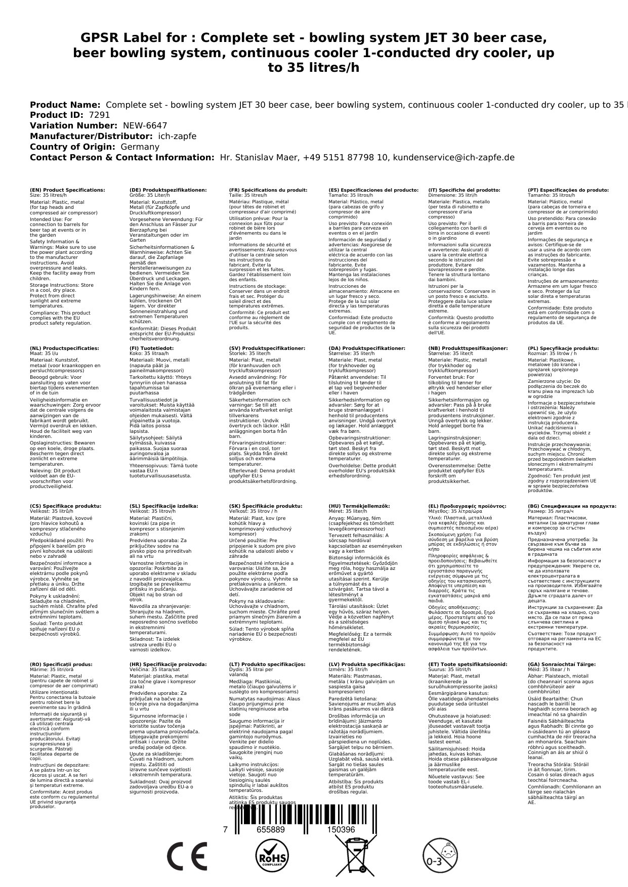 Tehnični podatki: teža 14,5 kg, mere B/T/V 167/281/368 mm (vključno s kapljično posodo), napetost 230 V, 50 Hz, moč 267 W, 1,16 A, kompresor 1/8 PS, ena vod za pivo, ohišje kovinsko, prašno barvano, odporno na rjo.