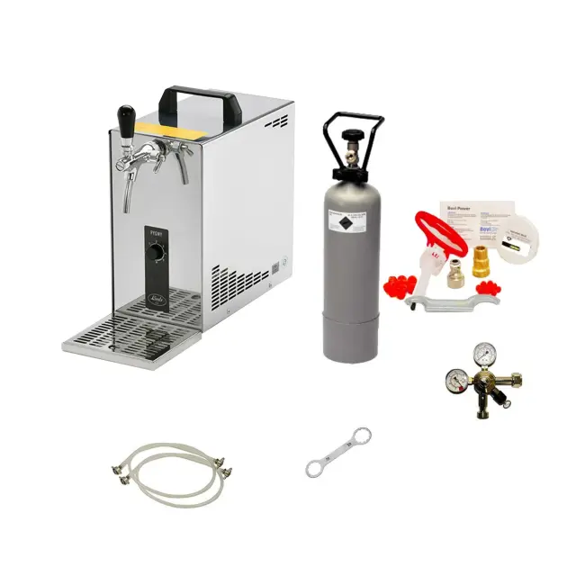 Kompletni set za črpanje piva PYGMY 25 je popolna rešitev za ljubitelje piva, ki želijo sveže in hladno pivo kadarkoli. Ta enocevni sistem vključuje visokokakovostni sušilni hlajevalnik iz nerjavečega jekla, ki doseže zmogljivost 35 litrov na uro pri 10 °C temperaturni razliki. Naprava se hitro segreje in ohladi v samo 2-4 minutah, kar omogoča takojšnjo uporabo. Temperaturo lahko regulirate med +2 in +10 °C za optimalno hlajenje.
