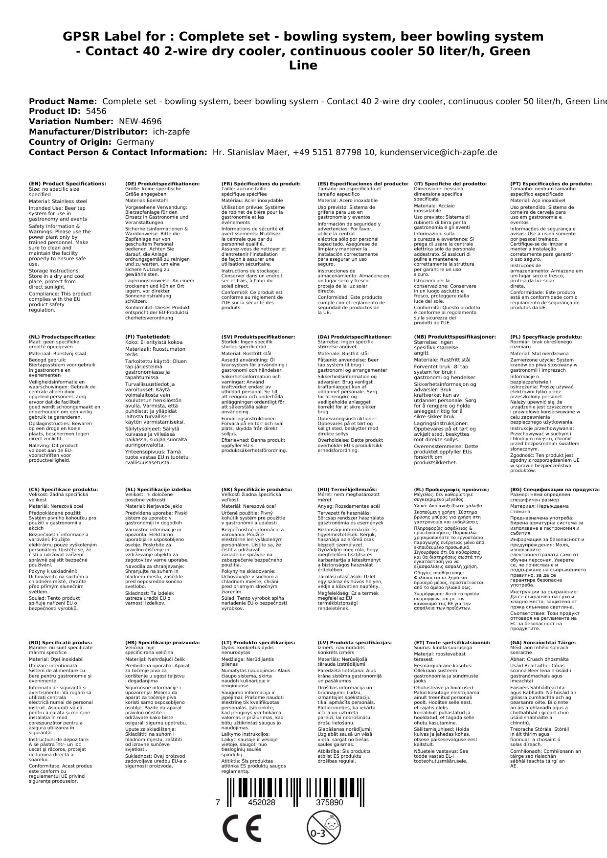 Tehnične specifikacije: 421 W / 230 V / 50 Hz, mere 225 / 330 / 425 mm, teža 26 kg. Vključuje regulator tlaka, CO2 jeklenko 2 kg, cevi in ključe za ogljikov dioksid. Izberite ventile: Kombi ali KeyKeg. Green Line zagotavlja 45% večjo učinkovitost hlajenja.