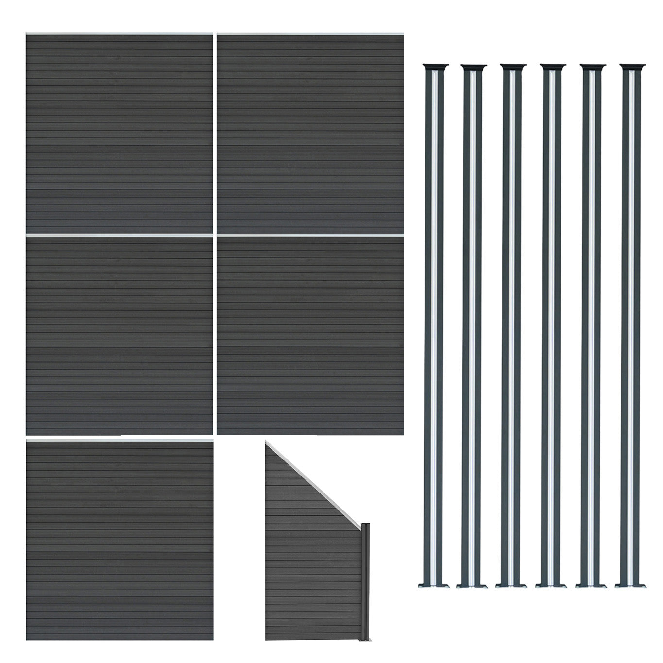 Za dopolnitev montaže s čistim, arhitekturnim pridihom komplet vključuje tudi ujemajoč se kotni element. Ta značilna poševna plošča, namensko zasnovana za zaključek ograje ali elegantno uokvirjanje vrat, odraža konstrukcijo glavne ograje, saj jo sestavlja 5 WPC desk polne širine, združenih s 4 kotnimi deskami, ki se zožijo in ustvarjajo edinstven profil. Kotni del je na poševnem koncu podprt s krajšim aluminijastim stebričkom in se na višji strani brezhibno vstavi v polno velik steber za varen in integriran zaključek.