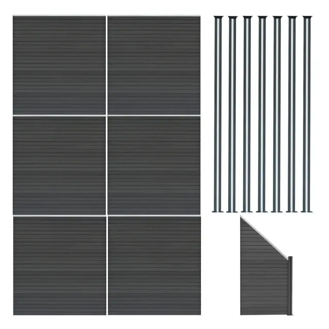 Ograjni panel, izdelan iz 9 medsebojno povezanih WPC (leseno-plastični kompozit) letvic, je zasnovan tako, da se brez težav sestavi in tvori močno, enotno strukturo, ki je zelo vzdržljiva in ne zahteva veliko vzdrževanja. Ko je ograja sestavljena, je impresivna, visoka 185 cm in 1138 cm, kar ponuja zasebnost in drzen, sodoben videz na vrtu.