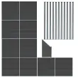 Za dopolnitev montaže s čistim, arhitekturnim pridihom komplet vključuje tudi ujemajoč se kotni element. Ta značilna poševna plošča, namensko zasnovana za zaključek ograje ali elegantno uokvirjanje vrat, odraža konstrukcijo glavne ograje, saj jo sestavlja 5 WPC desk polne širine, združenih s 4 kotnimi deskami, ki se zožijo in ustvarjajo edinstven profil. Kotni del je na poševnem koncu podprt s krajšim aluminijastim stebričkom in se na višji strani brezhibno vstavi v polno velik steber za varen in integriran zaključek.