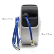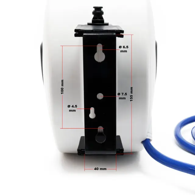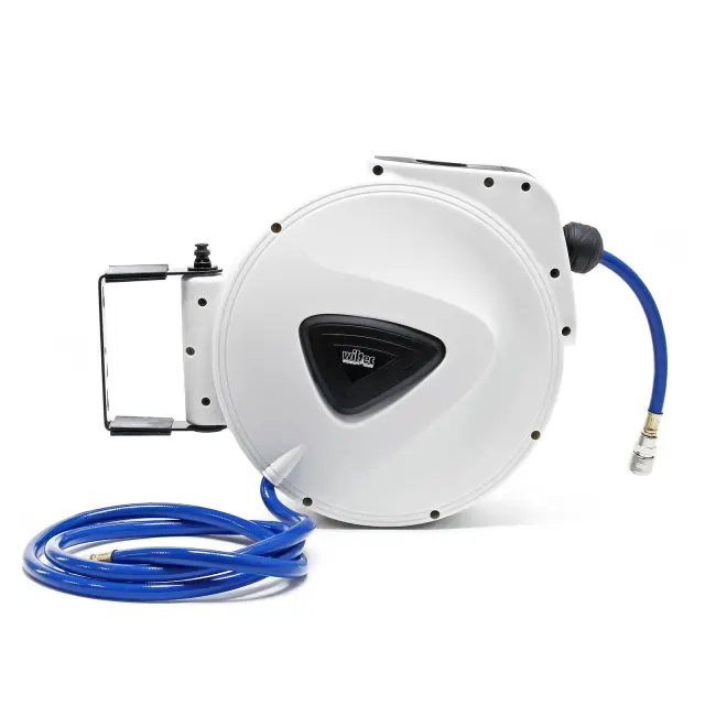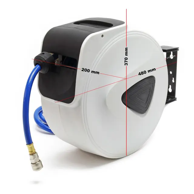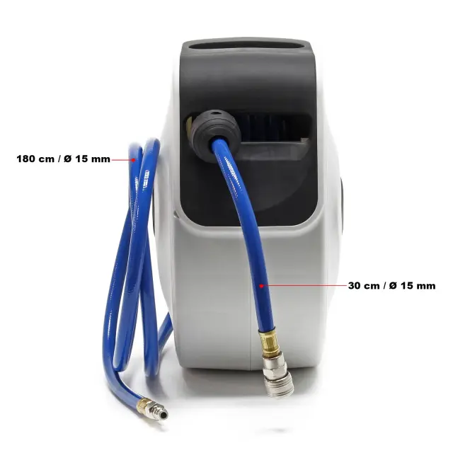 Kolut ima mehanizem samodejnega zaviranja, ki ga lahko odklenete, ko se rahlo povlečete nazaj. Sama odprtina cevi se lahko zasuka na stran, tako da se PVC tlačna cev lahko prožno uporablja v različnih smereh.
