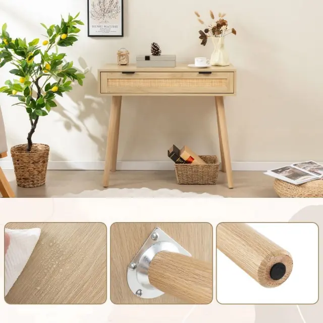 Umetniška zasnova združuje eleganten umetni les s trendovskimi poudarki iz ratana, ki zagotavljajo naravni čar in dobro prezračevanje, kar zagotavlja edinstveno in osvežujočo estetiko. Uživajte v praktični velikanski mizni plošči, ki ponuja veliko prostora za dekorativne predmete, medtem ko velik izvlečni predal zagotavlja priročno rešitev za shranjevanje osebnih predmetov. Ta naglasna mizica je izdelana za vzdržljivost in stabilnost, zato je opremljena z varnostnimi napravami za preprečevanje prevračanja in nedrsečimi podstavki za noge, ki zagotavljajo varno podlago in miren spanec. Gladka, vodoodporna in na praske odporna površina zahteva minimalno vzdrževanje.