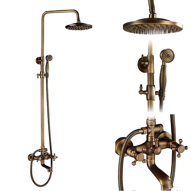 • Vsestranska zasnova: Starinsko medeninasta kopalna pipa z policami, dvojni ročaji, starinski slog. 8" premer dežnika, 5-17cm (3"--7") nastavljiv osrednji del pipe, 80-120cm(31"-47") skupna višina, namestitev s 3 luknjami.