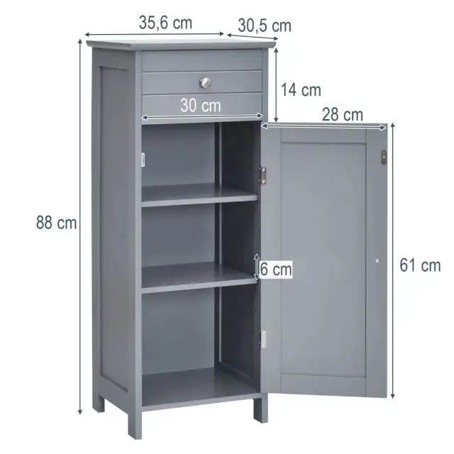 Izdelana je iz visokokakovostnih plošč MDF, zato je robustna in jo lahko uporabljate več let. Zaradi stabilne strukture je zelo trpežna. Opremljena je tudi z napravo proti nagibanju, ki zagotavlja varnost. Predmete lahko organizirate in shranite v omarici in predalu. Police so nastavljive, tako da na njih lahko namestite predmete različnih velikosti. Zaradi preprostega in sodobnega dizajna se odlično prilega vsem vrstam notranjosti in je odličen dodatek kopalnicam, dnevnim sobam, spalnicam in vhodnim prostorom!