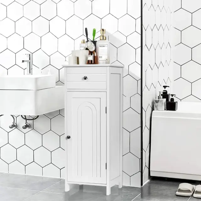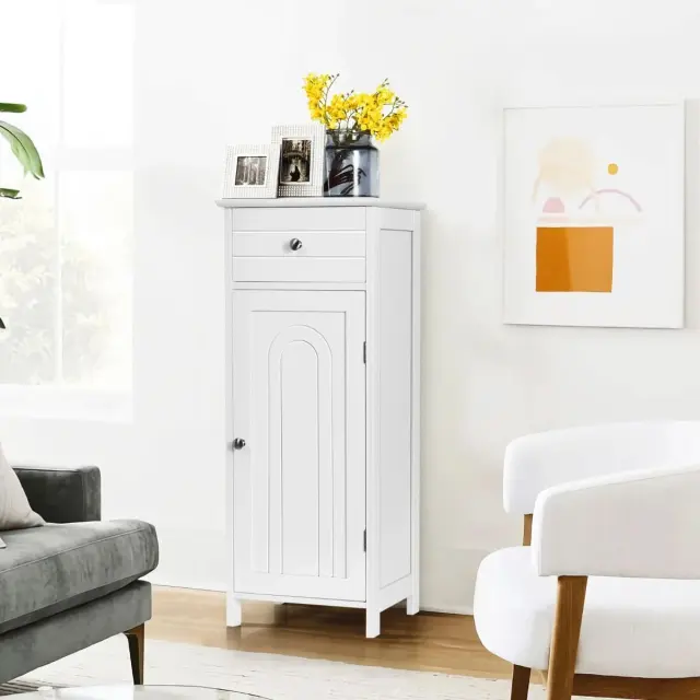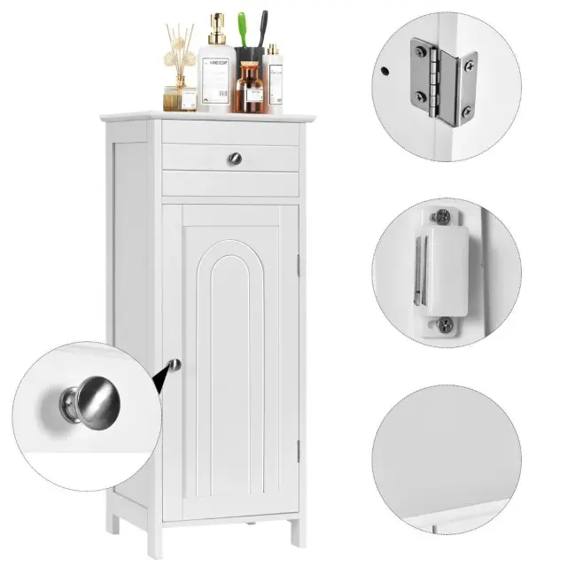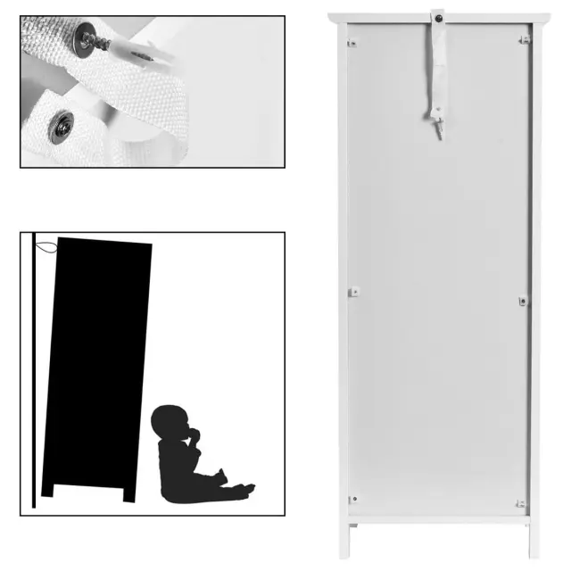 Izdelana je iz visokokakovostnih plošč MDF, zato je robustna in jo lahko uporabljate več let. Zaradi stabilne strukture je zelo trpežna. Opremljena je tudi z napravo proti nagibanju, ki zagotavlja varnost. Predmete lahko organizirate in shranite v omarici in predalu. Police so nastavljive, tako da na njih lahko namestite predmete različnih velikosti. Zaradi preprostega in sodobnega dizajna se odlično prilega vsem vrstam notranjosti in je odličen dodatek kopalnicam, dnevnim sobam, spalnicam in vhodnim prostorom!